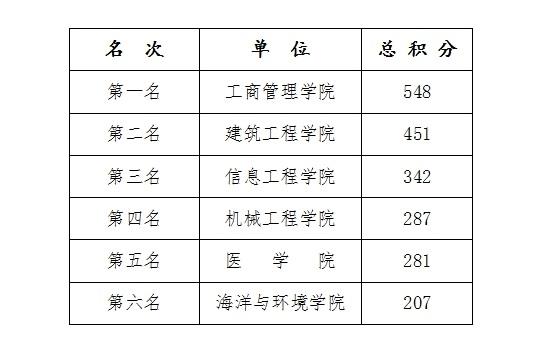 黄雅敏副院长宣布湄洲湾职业技术学院第十四届田径运动会顺利闭幕,并致闭幕词。黄副院长充分肯定了运动员们的奋勇拼搏、勇争第一的精神,这是湄园精神的体现,希望大家在工作、学习和生活中积极发扬这种奋斗精神,全面推动我院各项事业的发展。本届运动会共有 461名运动员报名参赛,参加16个大项、38个小项的角逐。工商管理学院、建筑工程学院、信息工程学院分获团体总分前三名,机械工程学院、医学院、海洋与环境学院等6个院系获得体育道德风尚奖。具体积分情况如下: