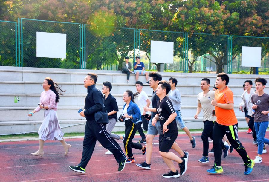 近日,福建省湄洲湾职业技术学院工商系党总支书记陈凯带领全系青年学生在操场上跑步。据介绍,“与书记一起跑跑步”项目实施一年来,该系共有454名同学告别“宅”生活,参与跑步,个人的最高跑步里程达309公里,团体总跑步里程大约为10044公里,既增强全体师生的体质,又培养挑战自我的精神,丰富了业余文化生活。(陈各辉 余伟锋)