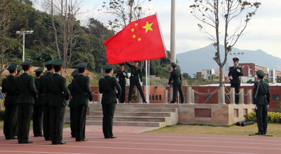 伴随着庄严的《中华人民共和国国歌》,五星红旗冉冉升起,迎风飘扬,师生全体肃立,行注目礼。