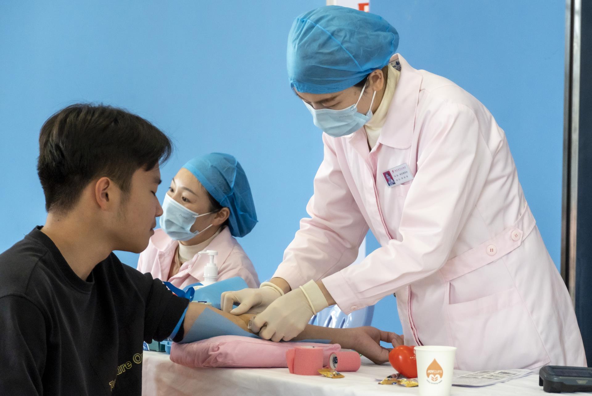 献血者学习献血的相关知识后,在医务人员的指导下,有条不絮的进行登记、抽血、化验。献血的同学们挽起袖管,坐在采血椅上,献出自己的青春热血,他们都是勇敢的战士。