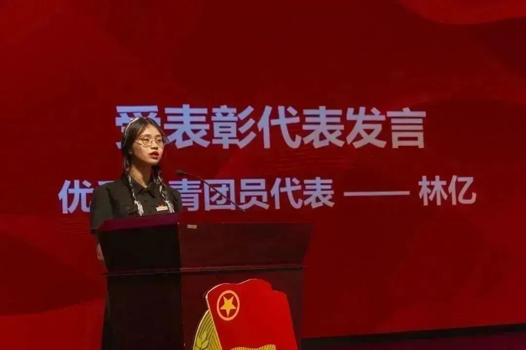 优秀团员代表医学健康系林亿同学进行发言,号召同学们在日常生活中要努力学习,苦练技能,作为青年一代要肩负社会责任和历史使命。