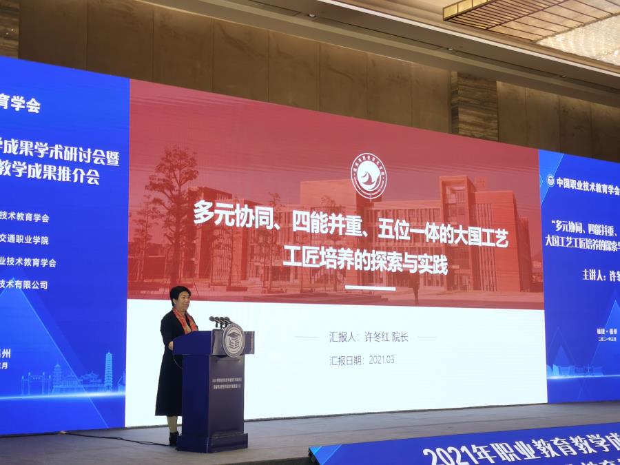 本次会议重点推介10项福建省职业教育优秀教学成果。我院院长许冬红作为获奖代表出席会议并在“主题报告”环节,以《“‘多元协同、四能并重、五位一体’的大国工艺工匠培养的探索与实践”》为题作了成果交流分享。该项目获得2020年福建省职业教育省级教学成果特等奖。