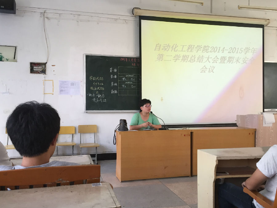 自动化工程学院于2015年06月16日16时在17号楼102举行了“2014-2015学年第二学期总结大会暨期末安全会议”,系书记、辅导员出席本次会议,全体同学安静有序的坐到各自的座位后,自动化工程学院期末安全会议正式开始。