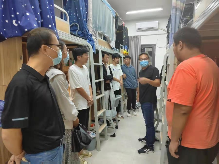 最后,陆主任带着大家去了21级新生宿舍。对于新生,陆主任则是更多引导大家多出去走走、跳跳舞弹弹乐器搞搞气氛、要吃饱饭。刚来学校,大家应该互相帮忙。学生们热情邀请老师们泡茶聊天,陆主任也跟学生约定以后一起喝茶聊天,让学生们感受到老师们的关心、感受到机械系的关怀。