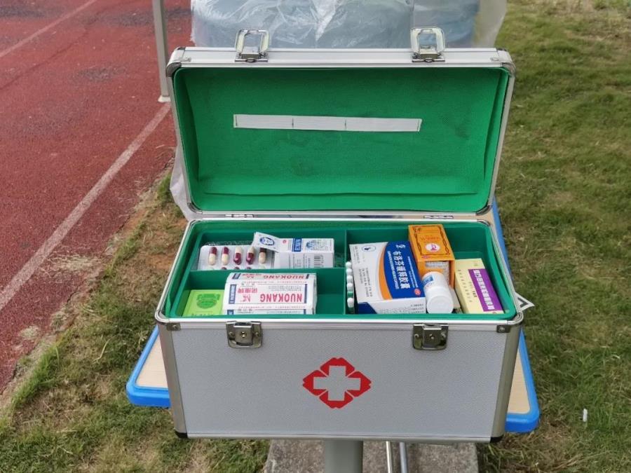 学院医务室在军训场地设置“军训医疗点”,安排医护人员随时为身体不适的参训学生提供医护服务,并配备有藿香正气水、生理盐水、碘伏等常备药品,及时处理突发状况。