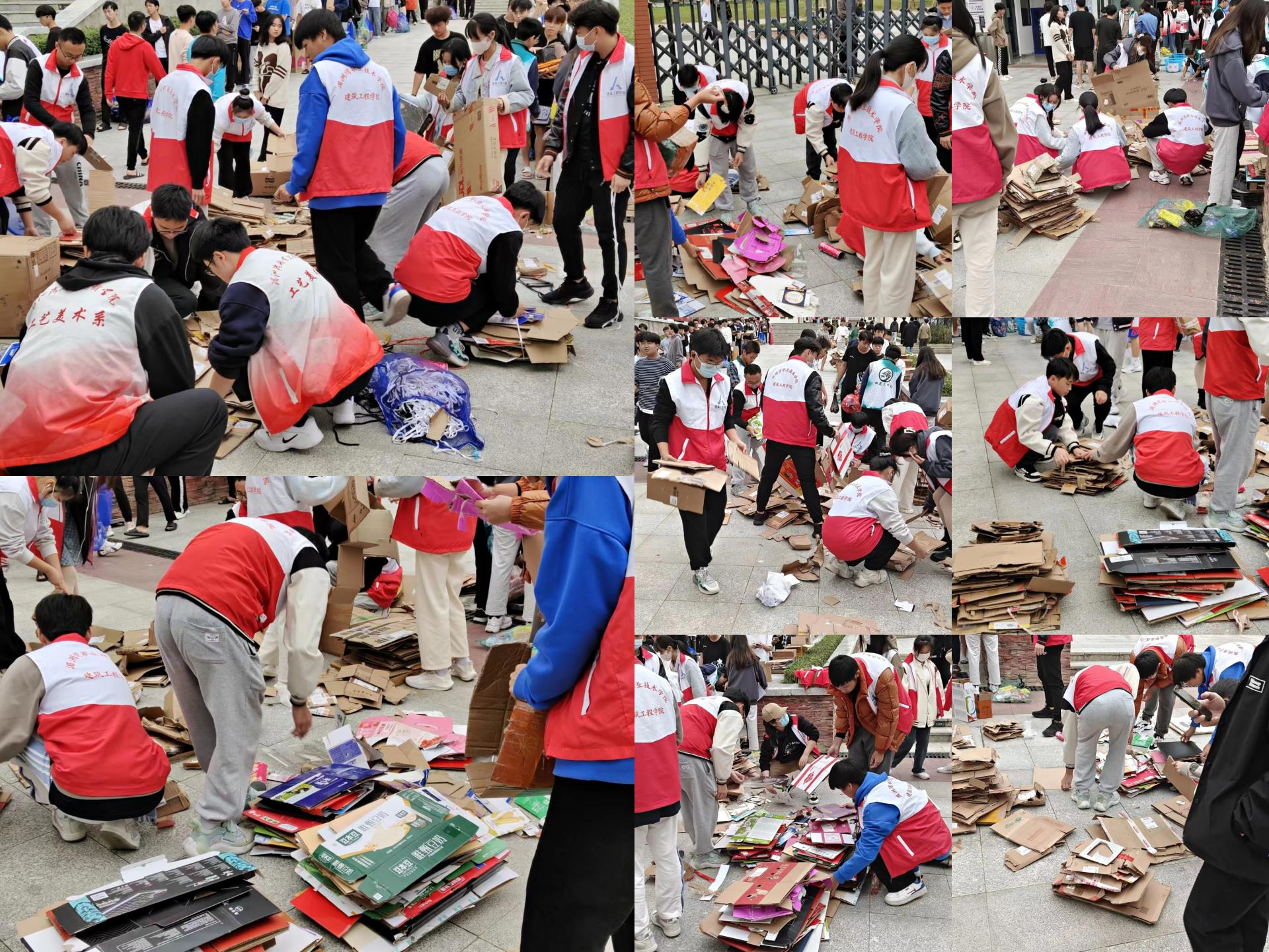 活动一开始,志愿者们并引导同学们来到垃圾回收站点,并按照楼栋有序排队,将测量称重,回收纸皮和瓶子进行分工。活动期间,现场井然有序,志愿者们积极引导同学们进行正确的垃圾投放,并为其普及垃圾分类知识,他们积极向上的态度,不畏艰辛的精神感染了在场的同学们,同学们纷纷配合志愿者们将瓶子踩扁放入回收袋中,瓶盖放入相应的篮子中,按有色,无色将纸皮进行分类。这提高了垃圾分类的效率,确保了本次垃圾分类活动的顺利进行。