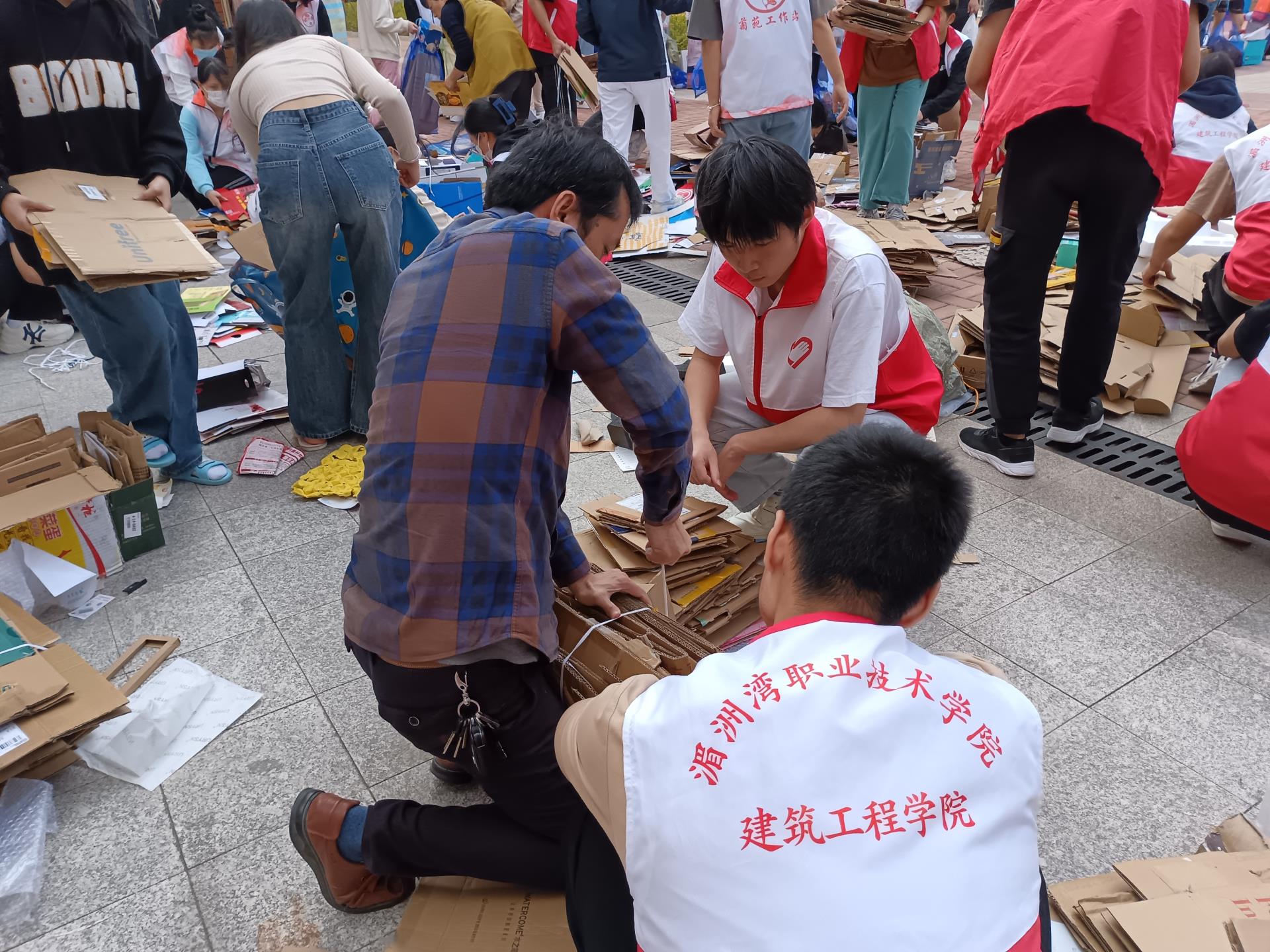 活动进行时,同学们十分有秩序的将本周的可回收垃圾带来现场,由志愿者们进行分类处理。在分类过程中,志愿者们将有色和无色的纸皮分开来,由大到小叠放捆绑;瓶身与瓶盖分开处理。在众多志愿者的协助下,活动条理有序、快速高效,本周的垃圾分类志愿者活动顺利举办。