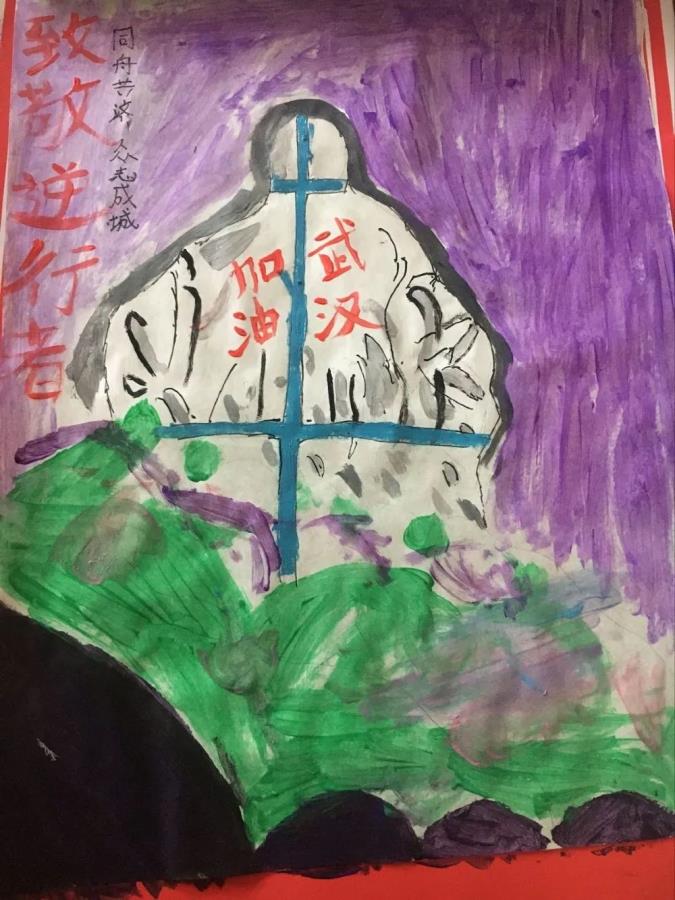 卢莉芳同学勾勒出医护人员高大挺拔的背影,让病毒为之恐惧,人们同舟共济,众志成城,才能消灭病毒。
