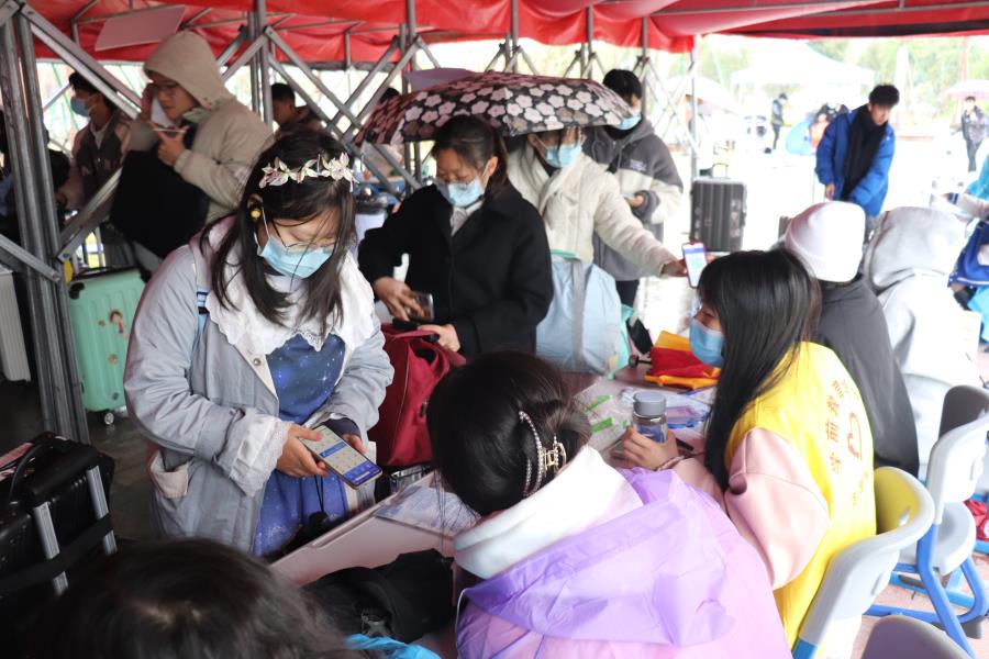 辅导员、老师及学生志愿者团队一大早来到校门口,热情迎接返校学生,并与返校的学生亲切交谈。