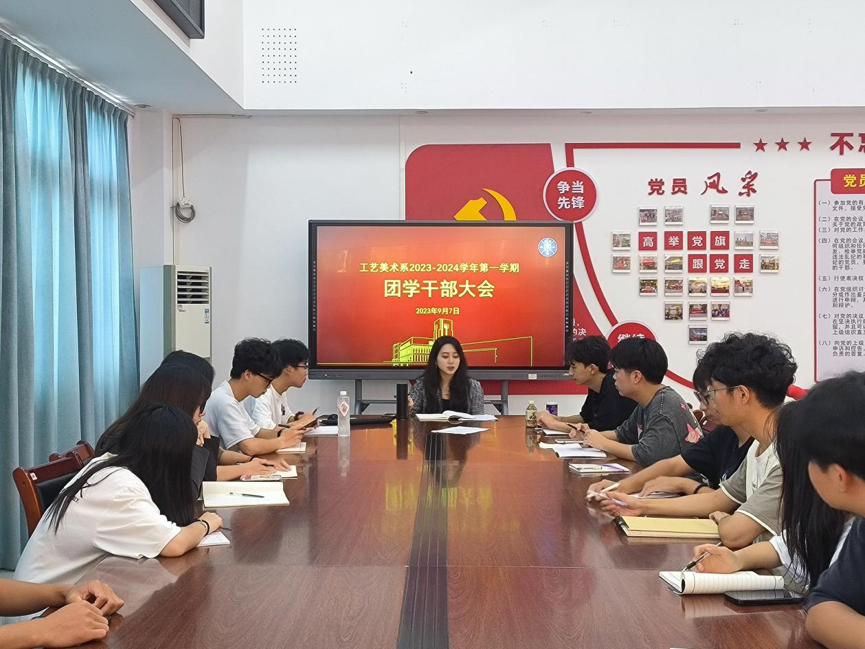 工艺美术系开展“奋进新征程,建功新时代,唤起青年担当”为主题的第一学期团学干部“开学第一课”。新学期,新气象,新挑战,为充分发挥共青团在高校学生思想政治工作中的主力军作用,引导全系团学干部理解把握中国式现代化的理论体系和实践要求,带领全系团学干部共赴充满光荣和梦想的新征程让青春在谱写中国式现代化福建篇章中绽放绚丽之花。2023年9月11日工艺美术系分团委于工艺楼北403会议室开展2023-2024学年第一学期团学干部“开学第一课”,由系分团委书记黄婧雯主讲,各部门团学干部参加了此次会议。