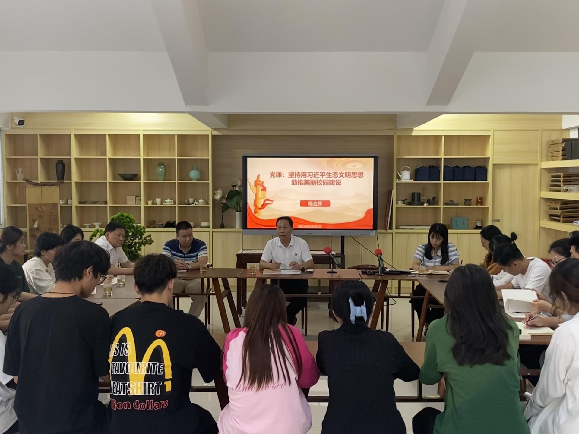 在专题党课上,杨金辉处长以《坚持用习近平生态文明思想助推美丽校园建设》为主题,从“从习近平生态文明思想的形成逻辑”“习近平生态文明思想的基本内涵”“用习近平生态文明思想建设美丽校园”三个方面进行了深入阐述。通过杨金辉处长的生动讲述和实例引导,师生们深入思考和感悟了党的创新理论所蕴含的思想伟力和实践伟力。他还向大家详细介绍了推动湄园新校区建设的思路,并鼓励全体师生树立担当意识,凝聚创业的精气神。
