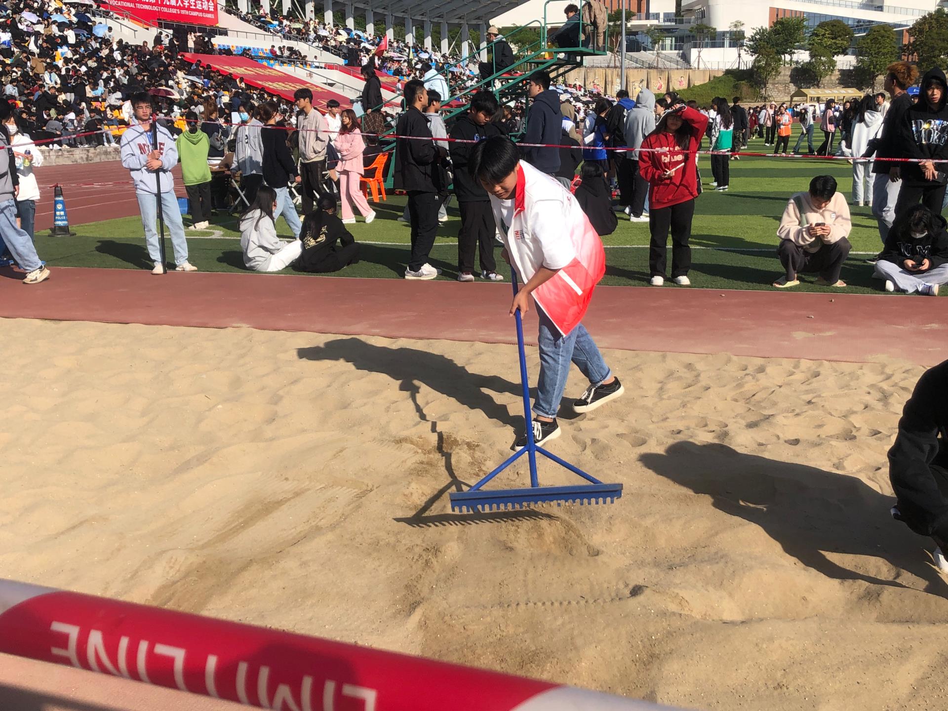 在校运动会期间,“红衣”志愿者他们无处不在,他们愿意用像蜡烛和萤火微弱的光芒为校运会增添光辉,让运动会的赛场上更加的美丽。“你好,需要帮忙吗”作为志愿者的他们愿意主动提供服务当运动员们在赛场上挥洒完汗水后,“红衣”志愿者们会奔向他们,向他们提供温暖的服务。