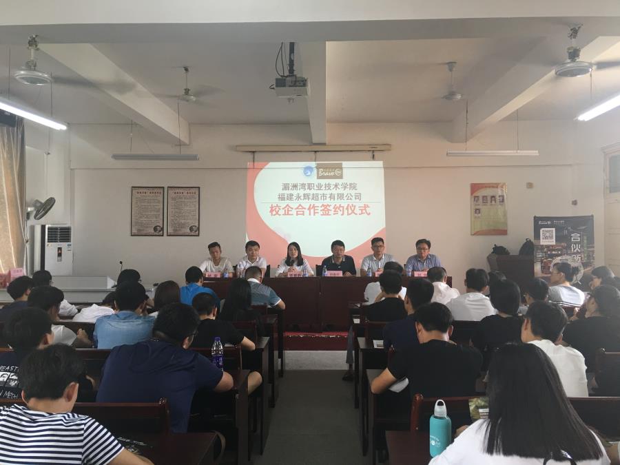 出席此次签约仪式的嘉宾有永辉平台-人才供给福建负责人贾慧静女士、永辉莆田区副区总黄细弟和林荣先生、以及邱荣木等四位品类教练、莆田区人事经理欧智楠,出席本次签约仪式的我院领导有湄洲湾职业技术学院教务处处长郑春华处长、工商管理系党总支书记陈凯、系副主任刘伟、学院校企合作办林庆林、欧海宁以及我系教师和营销专业同学们。