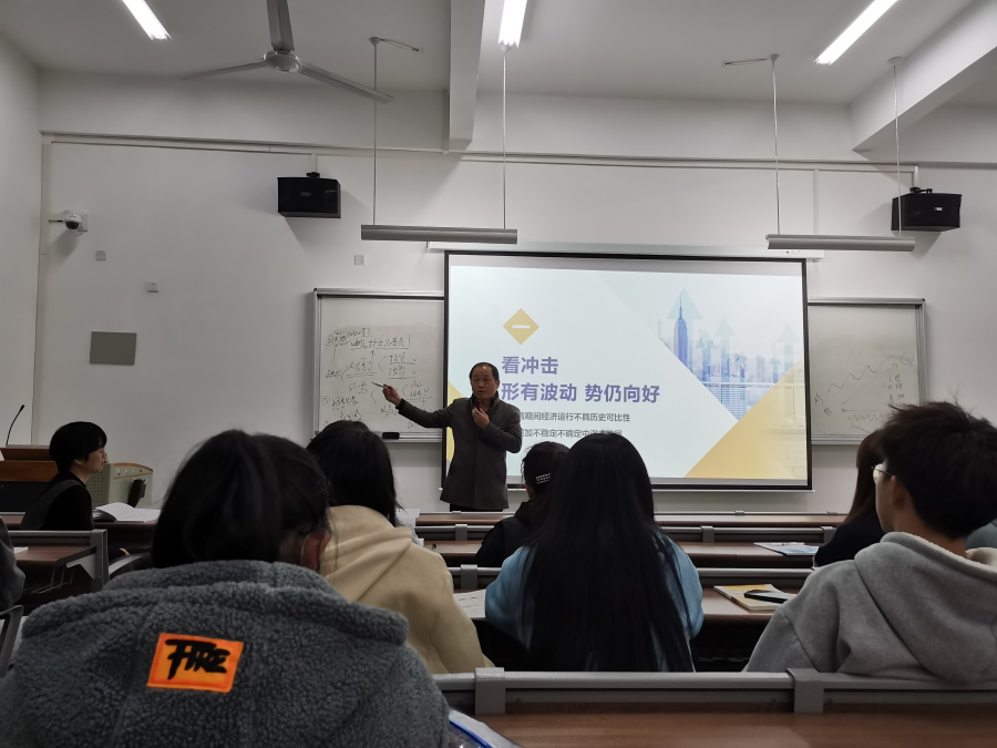 随后,陈副院长紧扣时代热点,运用丰富案例从“看冲击:形有波动、势仍向好”、“开药方:精准施策、’六保’护盘”和“观长远:化危为机、韧性依旧”三个部分对我国当前经济发展形势进行详细地阐述,引导同学们运用全面、辩证、长远的眼光来看待当前经济形势,有效地回应了同学们关注的焦点和热点问题。