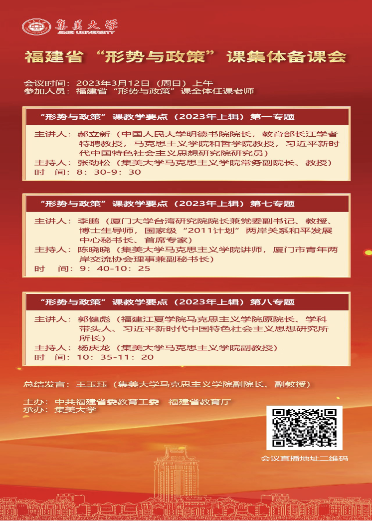 为提升《形势与政策》课程管理规范程度和教学质量效果,保障新学期《形势与政策》课程教学工作顺利开展,3月12日上午,我院组织全体教师线上收看了由福建省委教育工委、福建省教育厅主办,集美大学承办的福建省“形势与政策”课集体备课会。