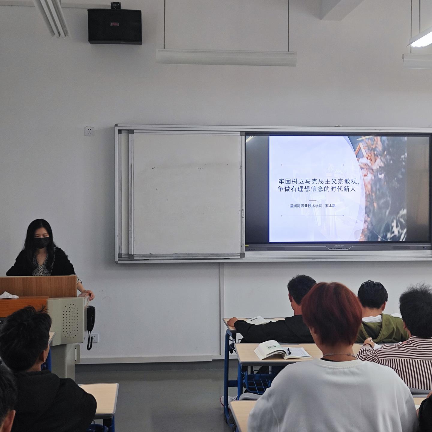 为深入学习宣传贯彻党的二十大精神,推进马克思主义宗教观教育,引导学生用科学的思想武装头脑、指导实践,2023年11月28日上午,马克思主义学院张冰霜老师在公教二南302为汽车制造与试验技术2302、2303班级开展了以“牢固树立马克思主义宗教观,争做有理想信念的时代新人”为主题的课堂宗教教育活动。
