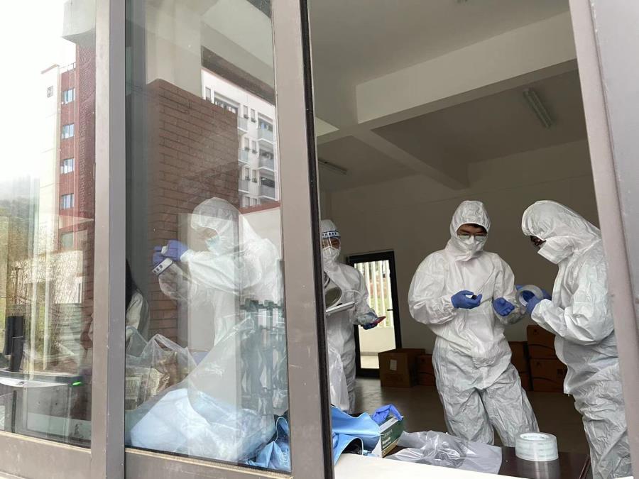 在食堂配餐到位后,学院按照楼层、宿舍划分原则,将餐食交与志愿者进行配送。志愿者们按照防控要求,穿上严密的防护服领取餐食,送到指定宿舍门口,确保隔离的师生及时吃上新鲜、有营养的饭菜。