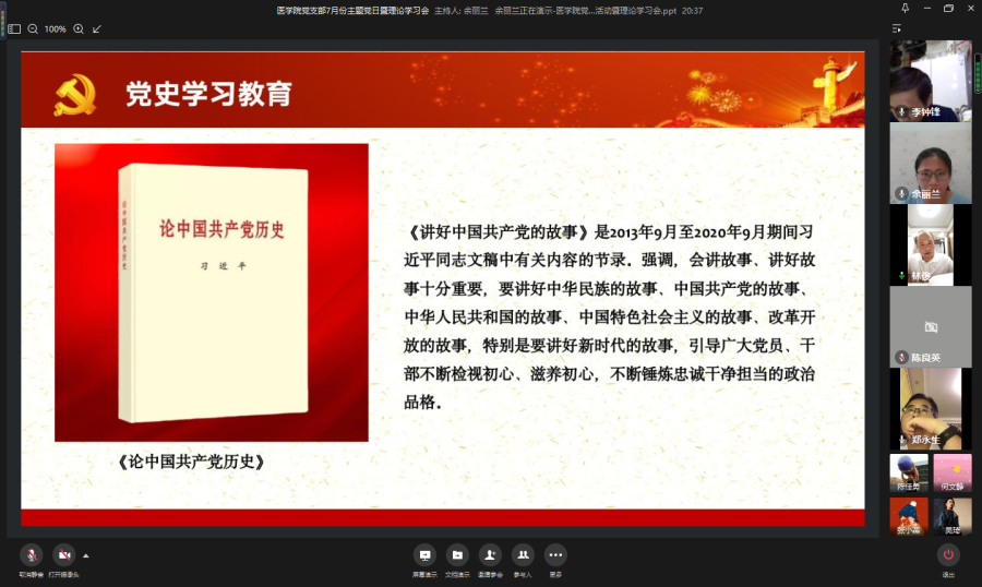 为学习贯彻习近平总书记在庆祝中国共产党成立100周年大会上的重要讲话精神,更好的打牢开好党史学习教育专题组织生活会的思想基础。医学院党支部于7月23日在企业微信线上开展7月份主题党日暨理论学习会。会议由党支部书记林俊主持,全体党员参会,部分入党积极分子列席参与。
