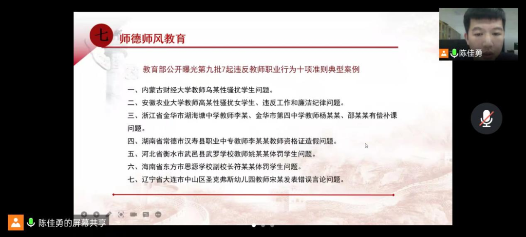 第二阶段,陈佳勇同志对师德师风教育专题开展学习,教育部公开曝光第九批7起违反教师职业行为十项准则典型案例。7起典型案例涉事教师均已受到严肃处理,反映出各地各校深入贯彻落实教师职业行为十项准则要求,加强教师思想政治和师德师风建设,严明底线红线,严肃查处师德失范问题的坚决态度。