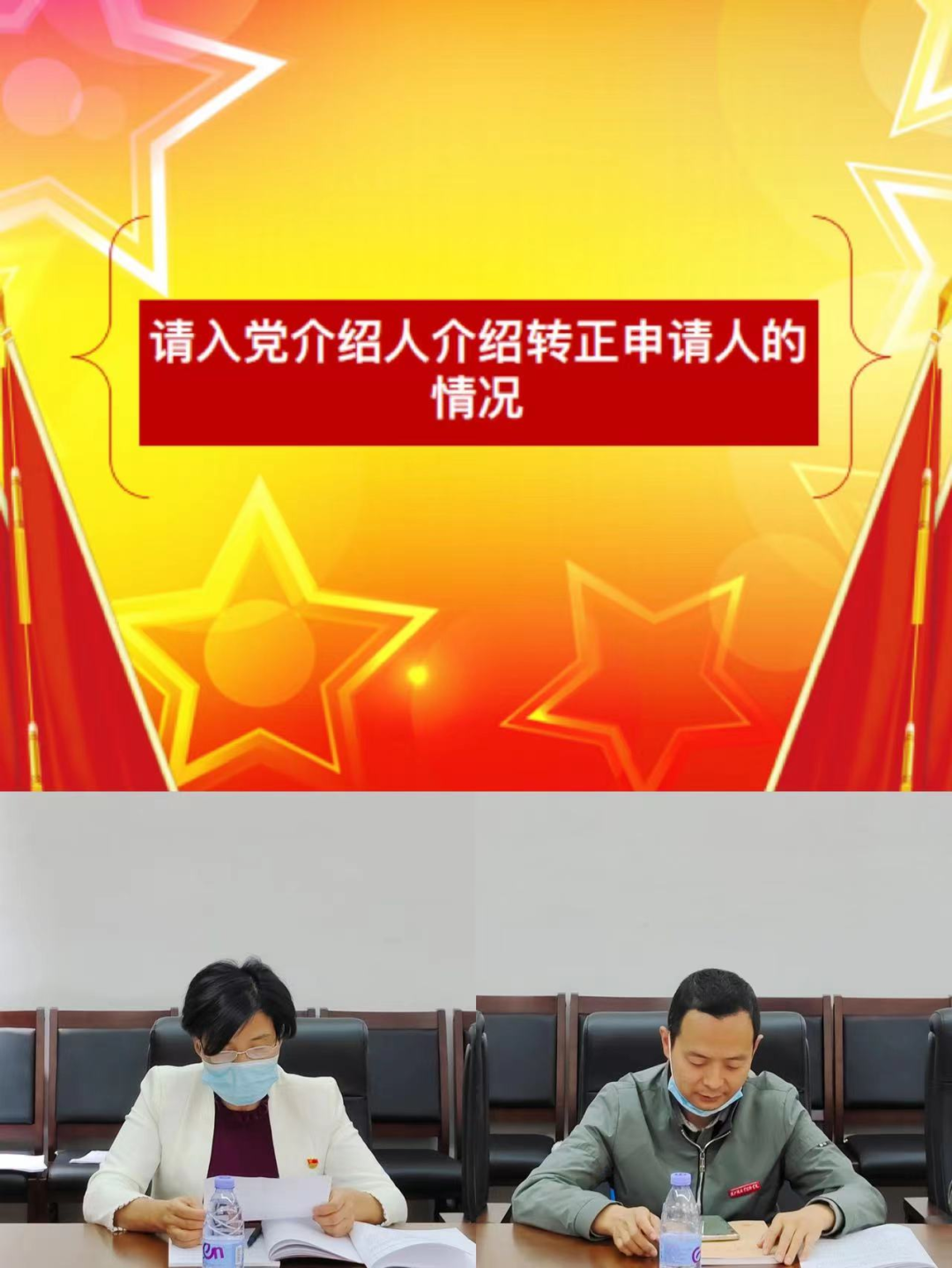 预备党员梁欣同志汇报预备期间的思想、工作情况,并宣读转正申请书。入党介绍人分别向大会介绍预备党员在预备期的思想、工作、生活等各方面的表现情况,并表明是否同意按期转正。组织委员郑永生老师代表支委会汇报一年来对梁欣同志的教育考察情况。与会党员对梁欣同志能否按期转正进行充分讨论。