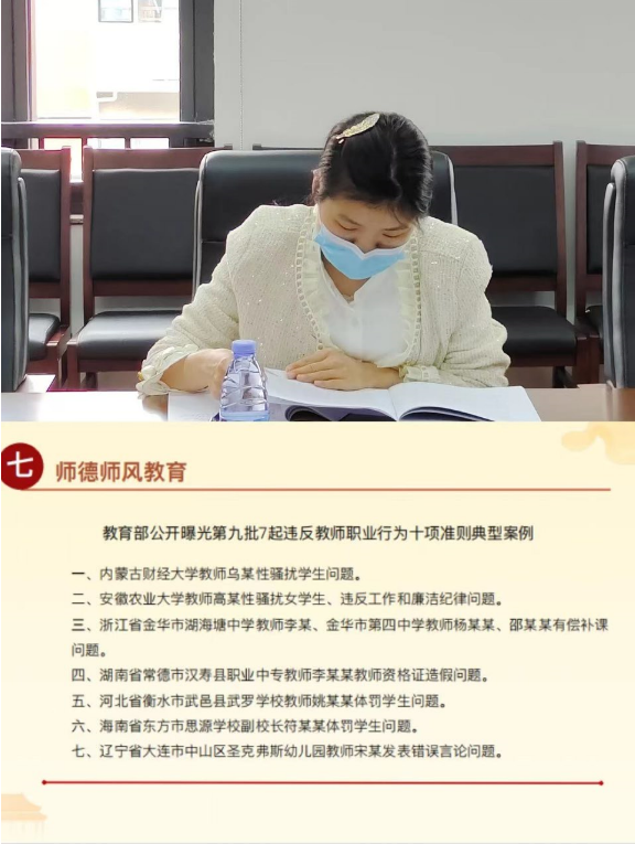 再接着,由支部纪检委员郑丽梅老师就师德师风教育及教育部相关文件专题展开学习。教育部公开曝光第九批7起违反教师职业行为十项准则典型案例,反映出各地各校深?贯彻落实教师职业行为十项准则要求,加强教师思想政治和师德师风建设,严明底线红线,严肃查处师德失范问题的坚决态度。