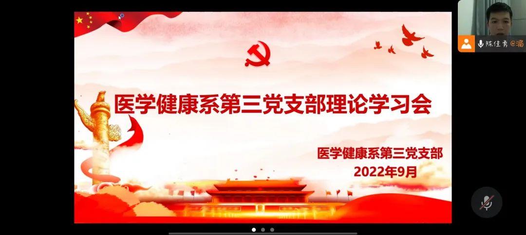今年是进入全面建设社会主义现代化国家、向第二个百年奋斗目标进军新征程的重要一年。为宣传和贯彻落实党的理论和方针政策,以实际行动迎接党的二十大的顺利召开,2022年9月29日晚上八点,医学健康系第三党支部书记陈佳勇通过企业微信线上召开九月份主题党日暨理论学习会,会议主要围绕:习近平:坚持和发展中国特色社会主义要一以贯之、习近平回信勉励北京师范大学“优师计划”师范生、《习近平谈治国理政》第四卷 | 坚持我国宗教中国化方向、教育部公开曝光第十批7起违反教师职业行为十项准则典型案例、福建省纪委监委通报三起违反中央八项规定精神典型问题、《中国共产党党员教育管理工作条例》、《中国共产党章程》第五章 党的基层组织、《闽山闽水物华新 习近平福建足迹(上)》八个专题进行研讨,支部全体党员师生参加会议。
