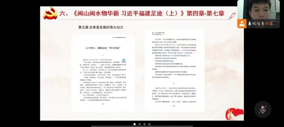 接着陈佳勇同志带领大家学习了在复兴之路上坚定前行——《复兴文库》序言其中这部典籍的出版,对于我们坚定历史自信、把握时代大势、走好中国道路,以中国式现代化推进中华民族伟大复兴具有十分重要的意义。在习近平在参观“奋进新时代”主题成就展时强调讲话精神以党的十八大以来以习近平同志为核心的党中央治国理政为主线,聚焦新时代10年党和国家事业的伟大成就。其次在中共福建省委印发《关于贯彻〈中国共产党统一战线工作条例〉的实施意见》其中包括加强党对统一战线工作的集中统一领导、加强和改进统一战线各领域工作、加强党外代表人士队伍建设、加强统一战线工作保障和监督。在中共中央办公厅印发《推进领导干部能上能下规定》提出以习近平新时代中国特色社会主义思想为指导,贯彻新时代党的建设总要求和新时代党的组织路线,吸收全面从严治党的新鲜经验,健全选人用人机制,对于推动用人导向和从政环境,建设高素质执政骨干队伍,具有重要意义。《闽山闽水物华新 习近平福建足迹(上)》第四章-第七章包括第四章站在创造未来的源头上、第五章改革是发展的强大动力、第六章对外开放兴,福建兴、第七章同心同德 兴民兴邦。同与会同志认真学习了中国共产党第十九届中央委员会第七次全体会议公报,全会充分肯定党的十九届六中全会以来中央政治局的工作、总结了党的十九大以来5年的工作、总结了党的十九届中央纪律检查委员会的工作。