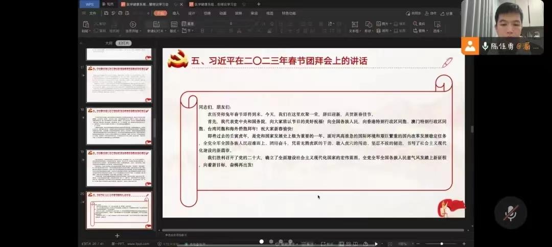 为深入学习贯彻落实党的二十大精神,奋力走好开局之年,2023年2月27日晚上八点,医学健康系第三党支部书记陈佳勇通过企业微信线上召开二月份主题党日暨理论学习会,会议主要围绕两个部分进行讲解,第一个部分:常规理论学习会,第二个部分:组织生活会会前理论学习会,支部全体党员师生参加会议。