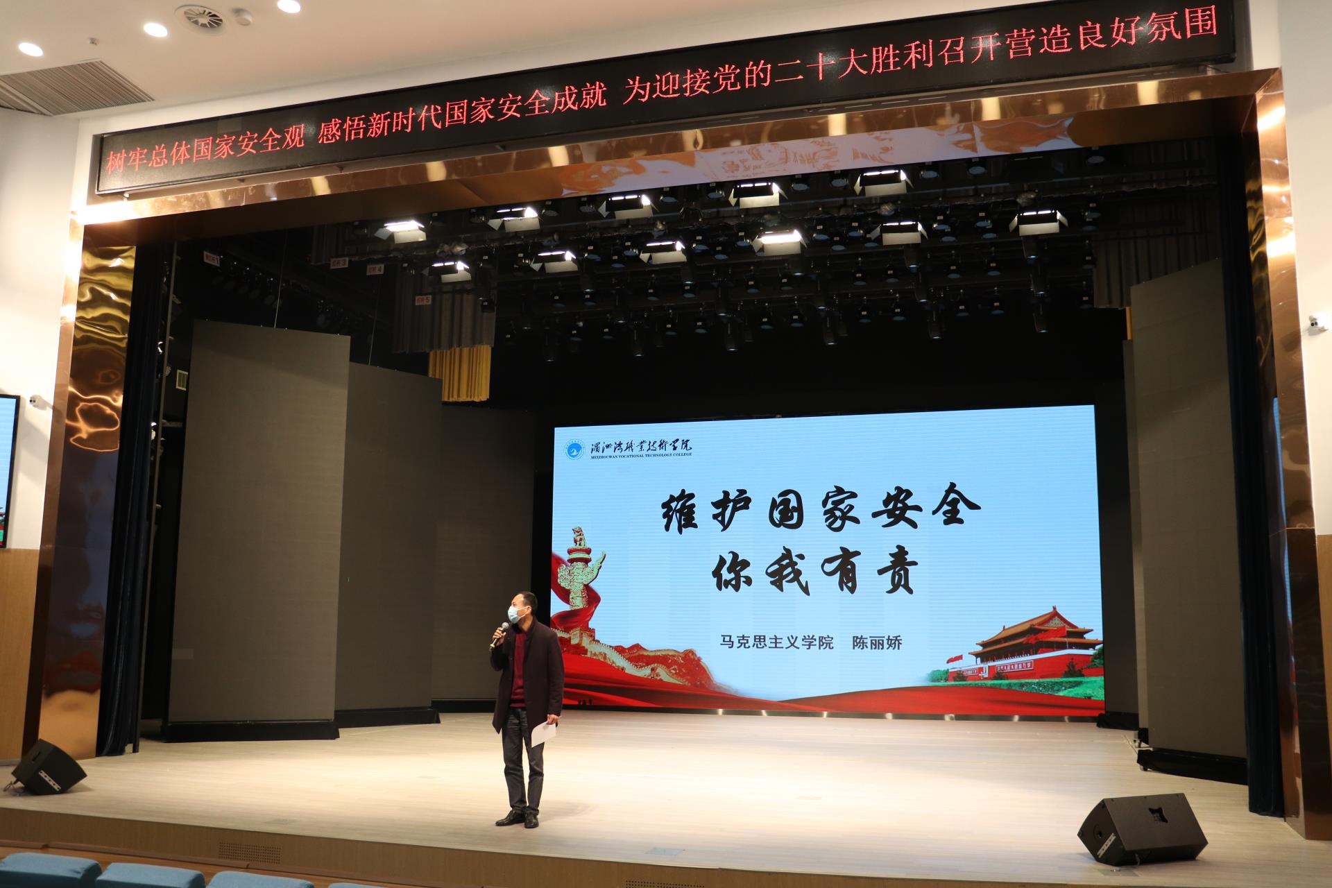 2022年4月15日是全国第七个全民国家安全教育日,为增强学生国家安全意识和保密意识,夯实国家安全社会基础,围绕“树牢总体国家安全观,感悟新时代国家安全成就,为迎接党的二十大胜利召开营造良好氛围”的主题,4月19日下午,在立言大礼堂开展了第七个国家安全教育日暨形势与政策讲座。讲座由安全保卫处负责人徐振东主持,马克思主义学院陈丽娇老师担任主讲,全院辅导员、班级安全员等师生代表共计四百余人参加。